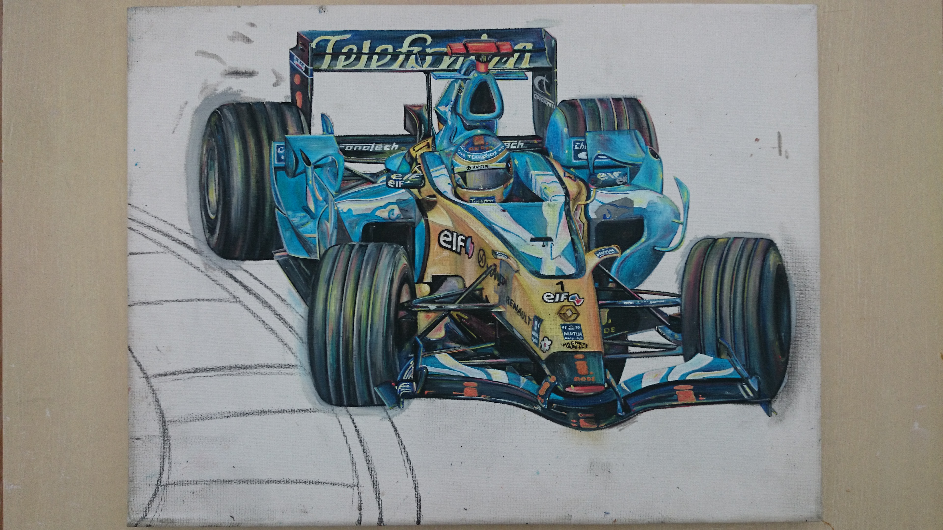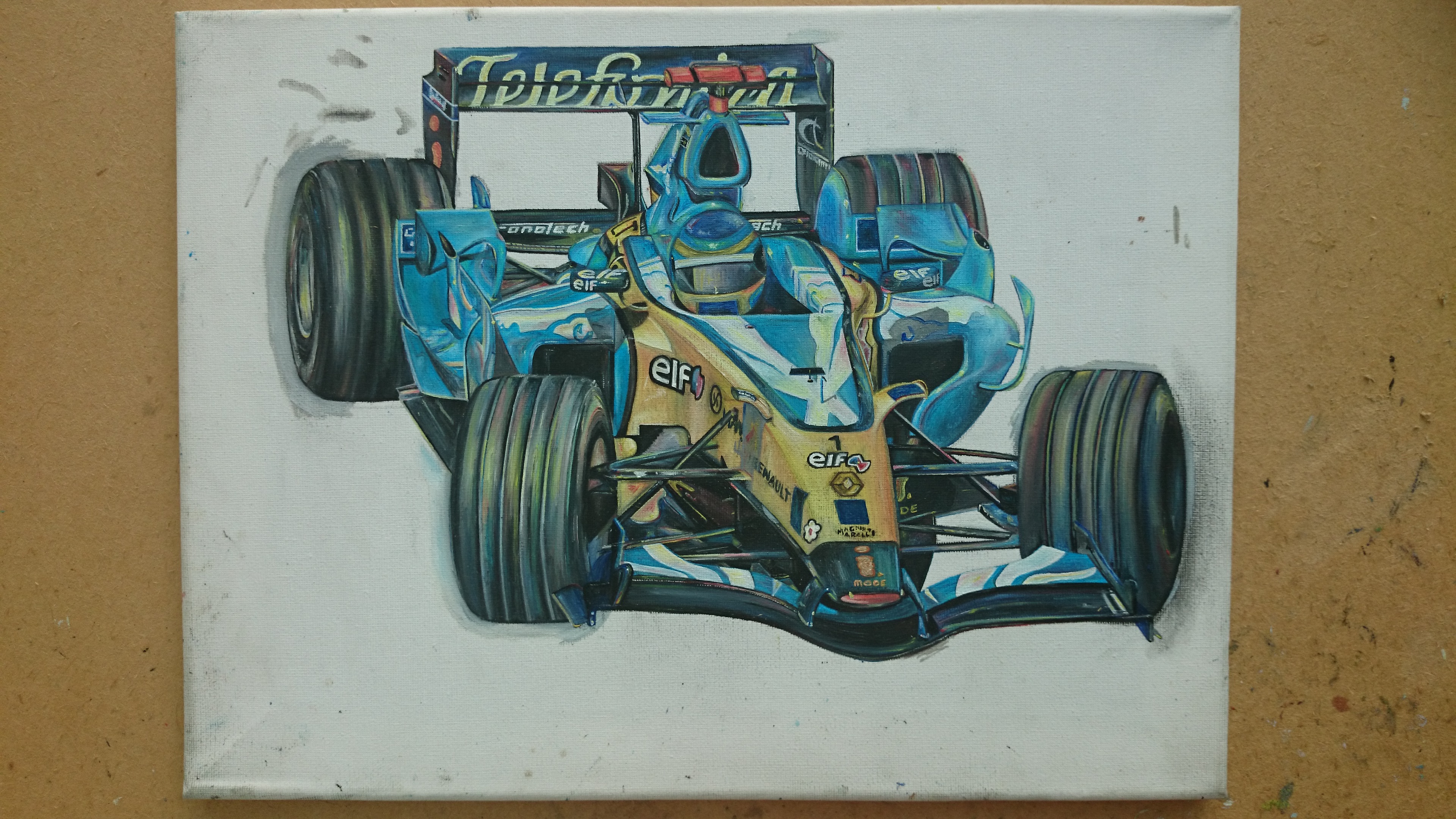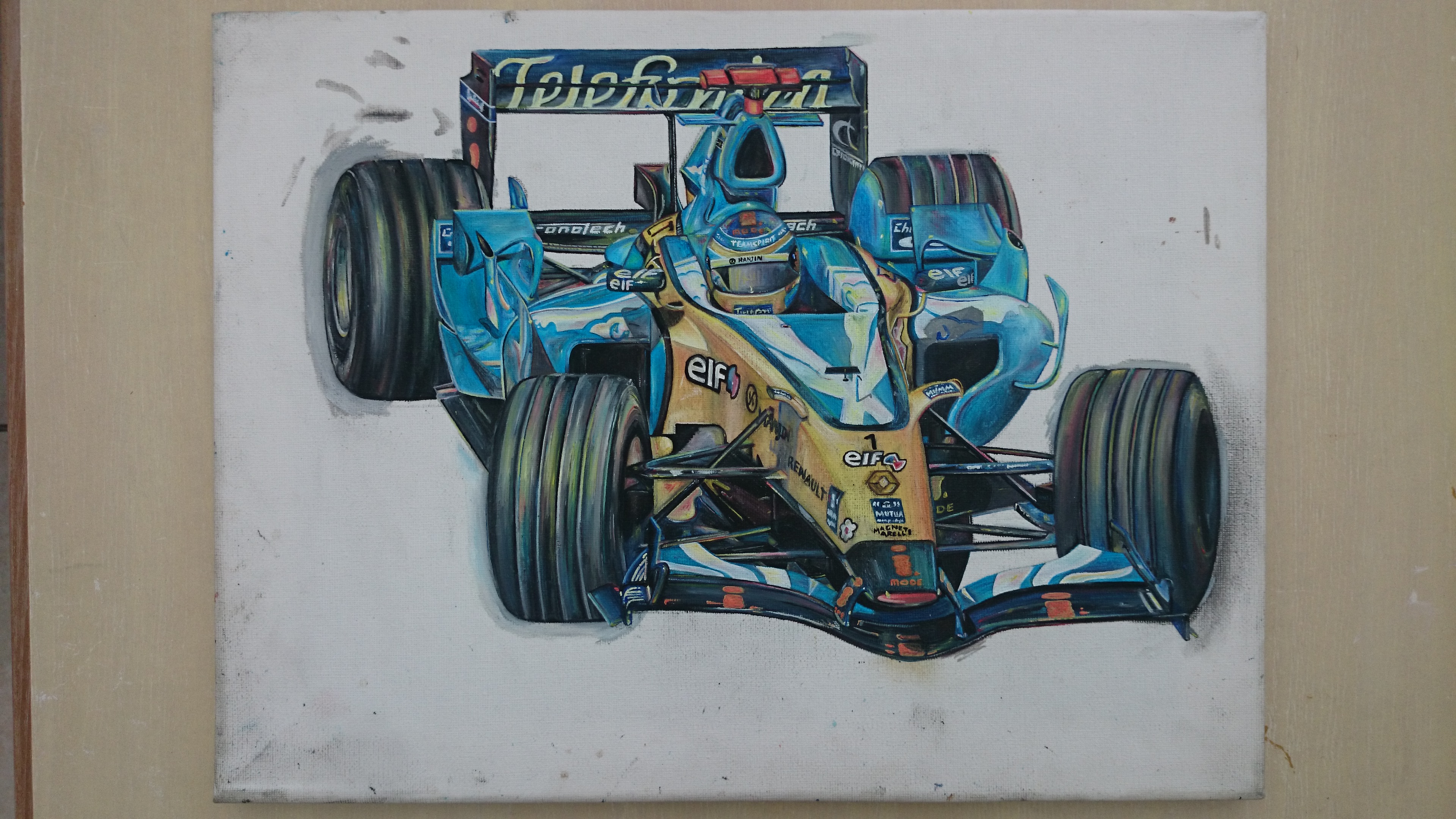 I have had a bit of gap between finishing the painting of Michael Schumacher and starting Tissington Church for a client and so I decided to use this time to start a painting of Fernando Alonso in his 2006 Renault from his championship winning year. I have started to paint the rear of the car around the exhaust and body winglets and am hoping to add some more paint during today (Sunday)