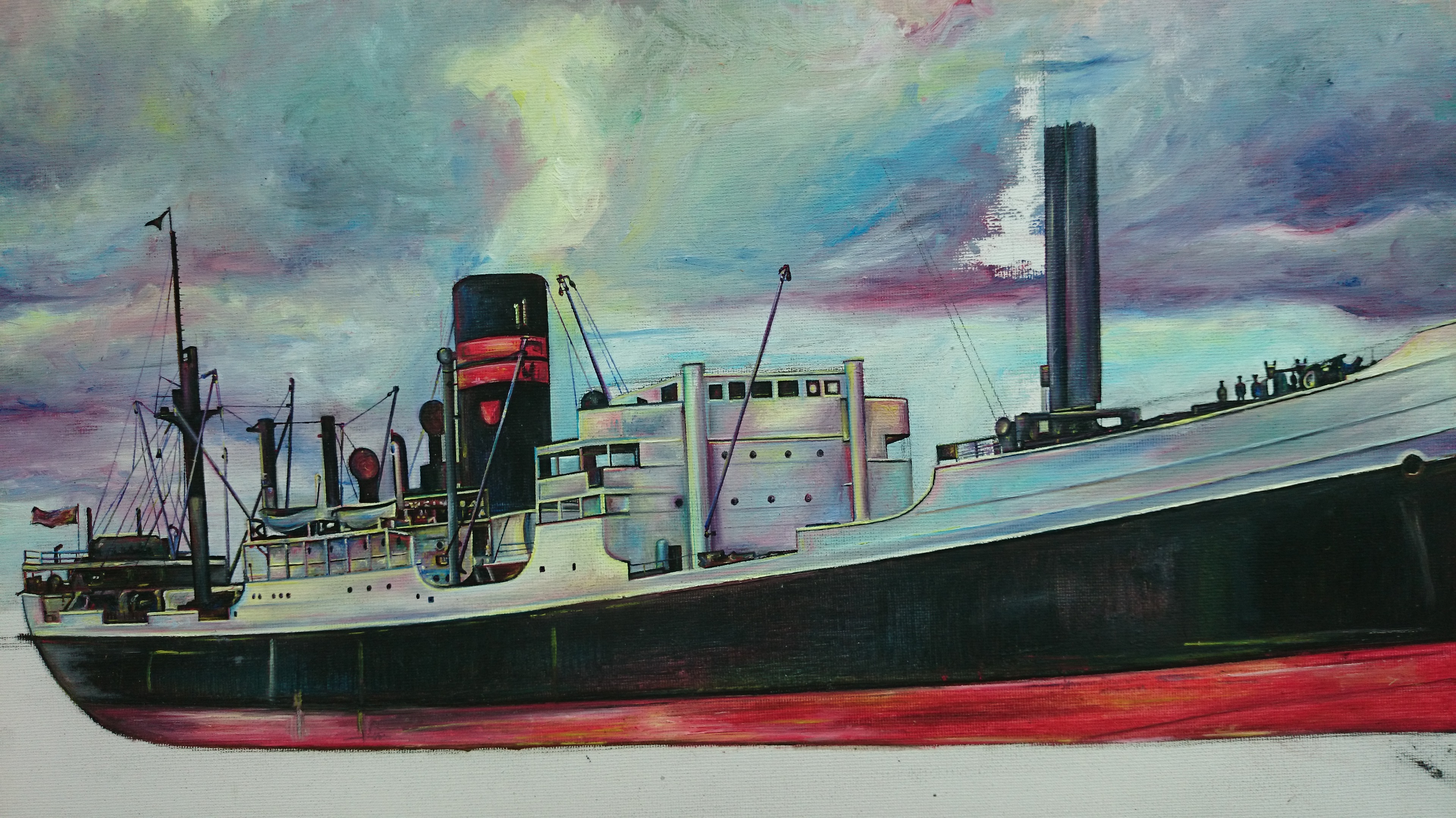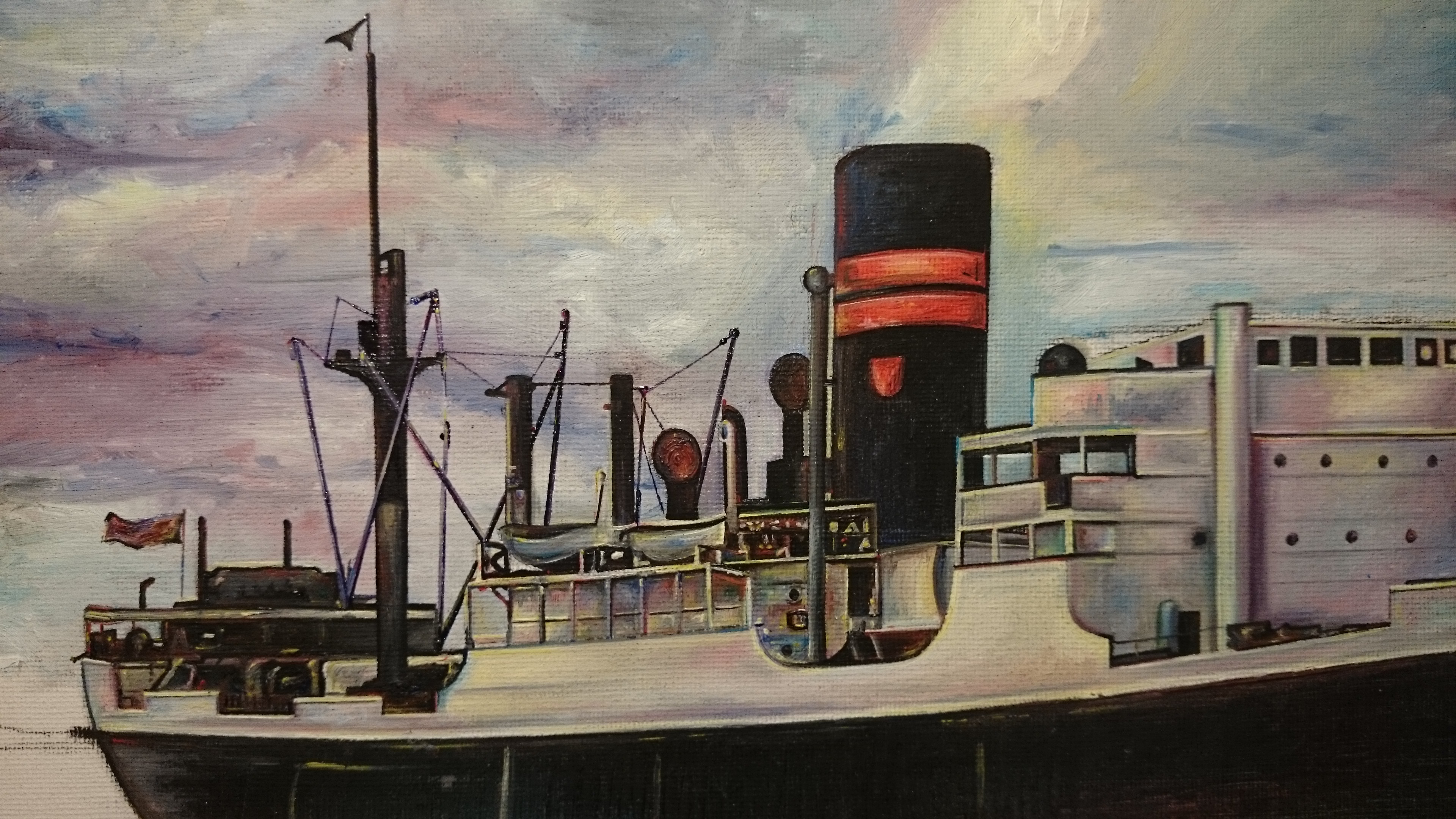 The painting of the Lanarkshire is close to being completed now that the front masts and gantry have been added. The name of the ship has also been added too along with further people and port holes. Over the next few weeks I will add the remaining cables, port holes, sea and land. All being well the painting should be completed by the end of April.