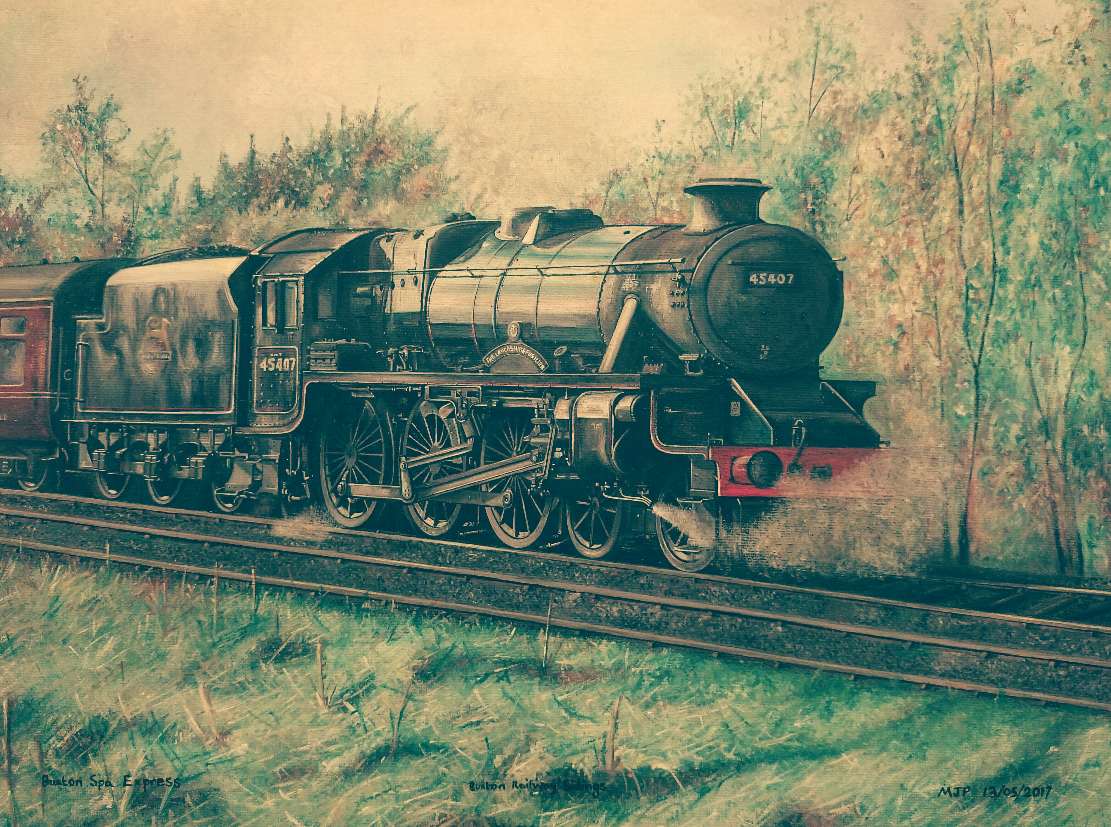 After 14 months of work (at weekends and after work on Wednesday evenings) I can now finally show you the final painting of the “Lancashire Fusilier” on the Buxton Spa Express. It has been painted on a A3 canvas with oil paints and mostly using a 0004 brush! My favourite parts are the details around the tender and main driving pistons which unsurprisingly took the longest part to paint. The painting will also be entered into the Derbyshire Open Art Competition at Buxton Museum and Art Gallery, I would love for the painting to go on display but obviously that is up for the judges to decide. The first image below is the original “untouched” picture followed by a few others using various filters. Over the next few months I am aiming to finish my painting of Lewis Hamilton before moving onto my summer holiday project of Concorde.