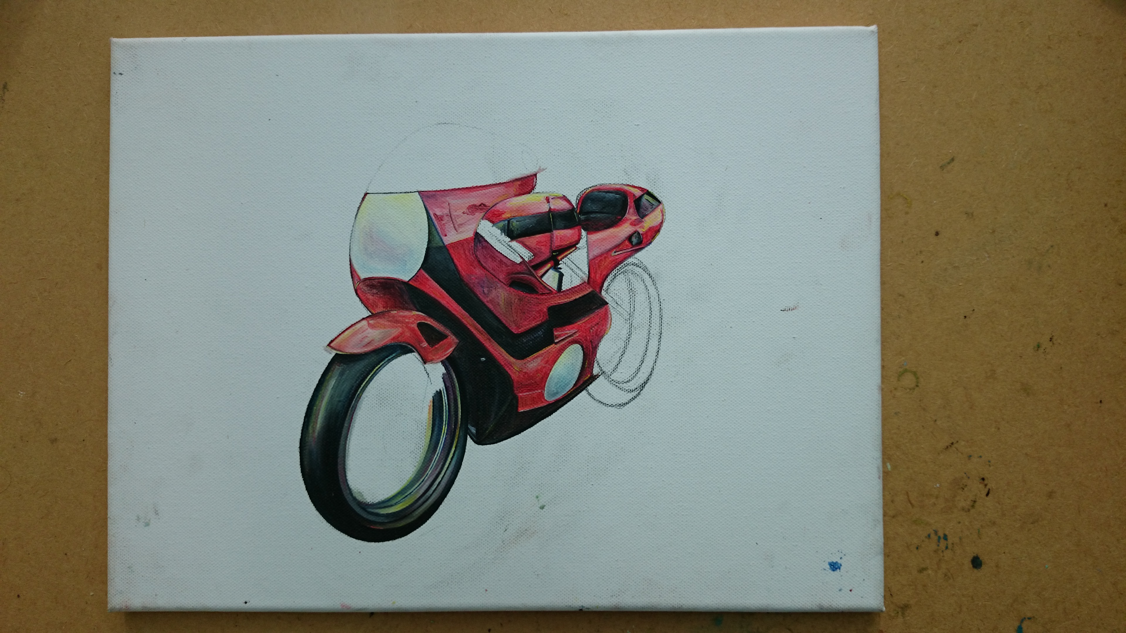 More progress has been made on the painting on the bike over the past few weeks. A majority of the paint bodywork and tyres have now been completed and I have been able to start adding some finer details. I have also started painting part of the background mostly behind the wheels, once this is dry it will allow me to start adding the wheel spokes and other wheel details. I am aiming to complete this painting by the Christmas break.
