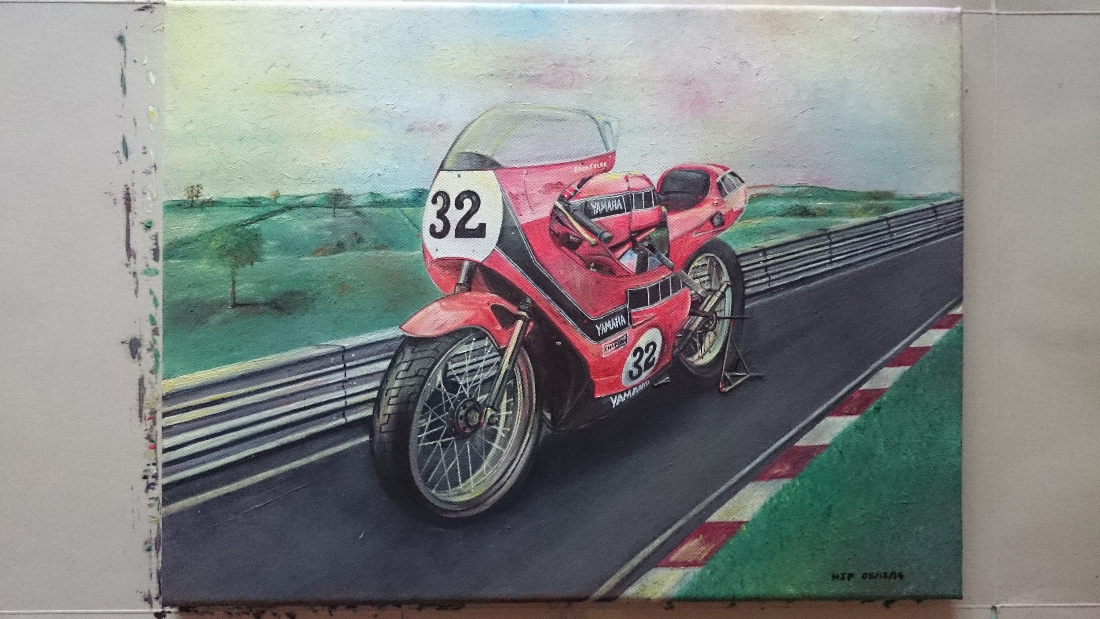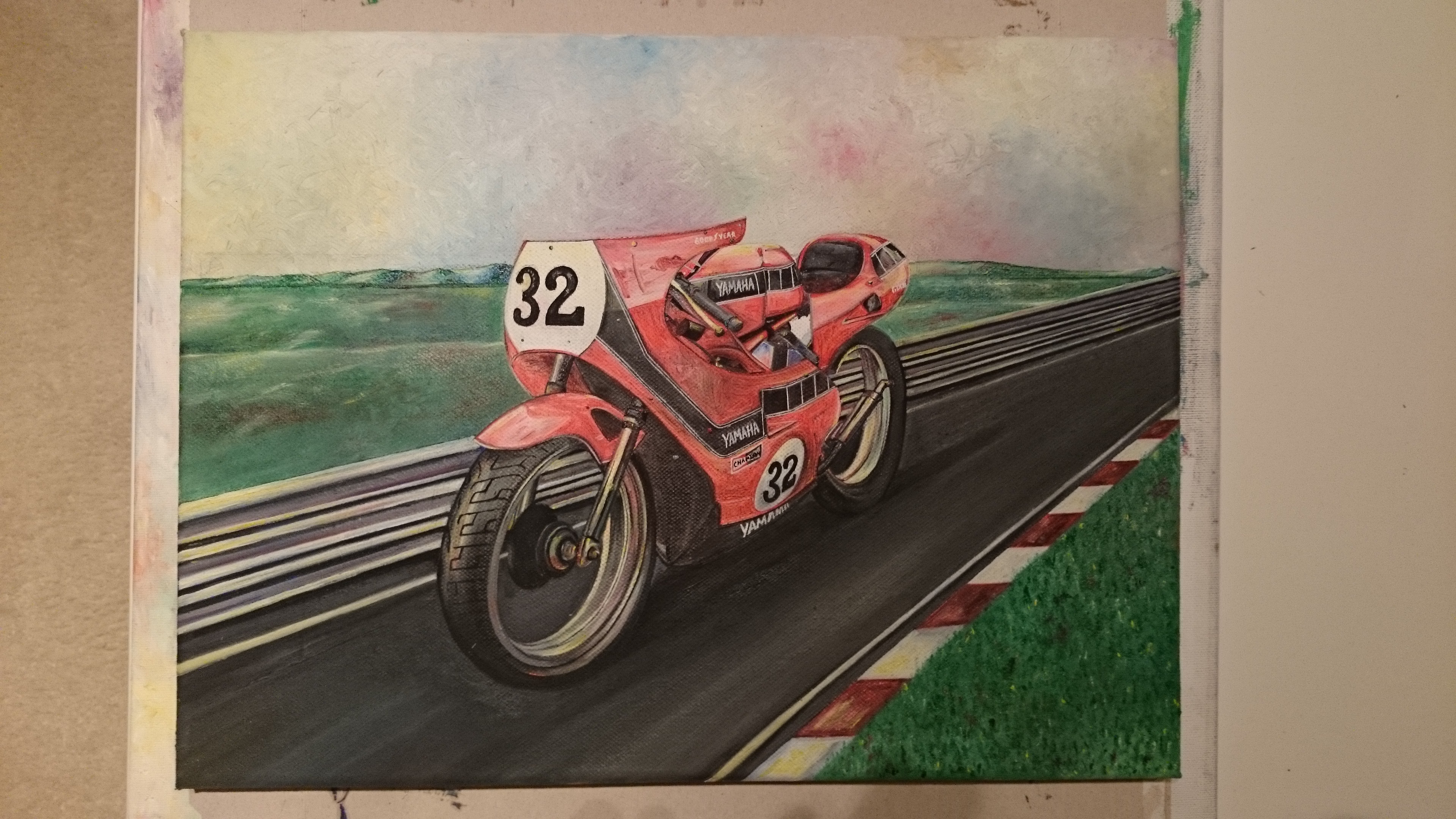 More progress has been made on the painting of the Yamaha bike and it is now nearing completion. A realistic background has been added with tress etc, along with a track side crash barrier, bike canopy and front wheel spokes. Rear wheel spokes and bike stand need to be added along with a few more background details before the painting is completed. I am aiming to finish the painting within the next week ready for delivery to my client.